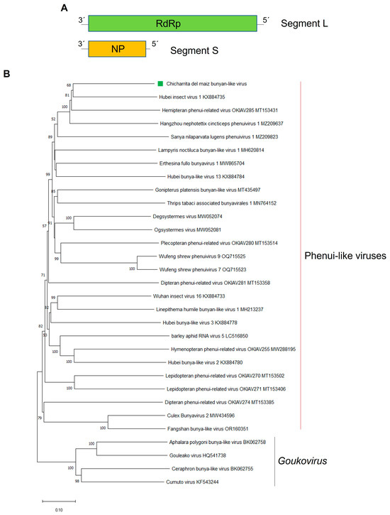 (A) Schematic representation of the genome organization of Chicharrita del maiz bunyan-like virus. (B) Maximum likelihood phylogenetic trees reconstructed using the RdRp protein sequence of Chicharrita del maiz bunyan-like virus and of representative bunyan-like viruses. Bootstrap values above 50% are shown (1000 replicates). Chicharrita del maiz bunyan-like virus is indicated with a green square. The scale bar shows the substitution per site.