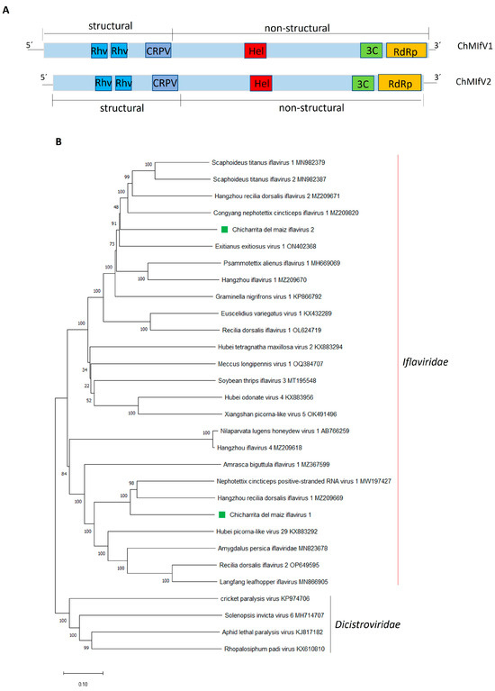 (A) Schematic representation of the genome organization of Chicharrita del maiz iflavirus 1 and Chicharrita del maiz iflavirus 2. Rhv, rhinovirus-like capsid protein; CRPV, cricket paralysis virus-like capsid; Hel, helicase; 3C, 3C-like protease; RdRp, RNA-directed RNA polymerase; (B) Maximum likelihood phylogenetic trees reconstructed using the RdRp protein sequence of Chicharrita del maiz iflavirus 1 and Chicharrita del maiz iflavirus 2 and of representative iflaviruses. Bootstrap values above 50% are shown (1000 replicates). Chicharrita del maiz iflavirus 1 and Chicharrita del maiz iflavirus 2 are indicated with green squares. The scale bar shows the substitution per site.