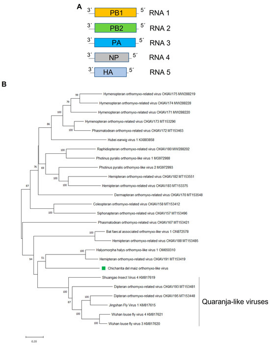 (A) Schematic representation of the genome organization of Chicharrita del maiz orthomyxo-like virus. (B) Maximum likelihood phylogenetic trees reconstructed using the PB1 proteins sequence of Chicharrita del maiz orthomyxo -like virus and of representative orthomyxo -like viruses. Bootstrap values above 50% are shown (1000 replicates). Chicharrita del maiz orthomyxo -like virus is indicated with a green square. The scale bar shows the substitution per site.