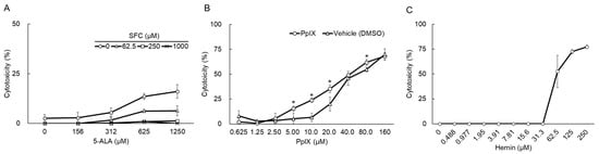 Cytotoxic effects of compounds. fcwf-4 cells were cultured with compounds for 24 h. After the incubation, WST-8 solution was added and cells were incubated for 1 h. The absorbance of formazan produced was measured at 450 nm. Percent cytotoxicity was calculated using the following formula: cytotoxicity (%) = [(OD of compound untreated cells–compound-treated cells)/(OD of compound untreated cells)] × 100. The results obtained are shown as means ± SE. Data represent three independent experiments. (A) 5-ALA-SFC combination. (B) PpIX *: p < 0.05 vs. vehicle. (C) Hemin.