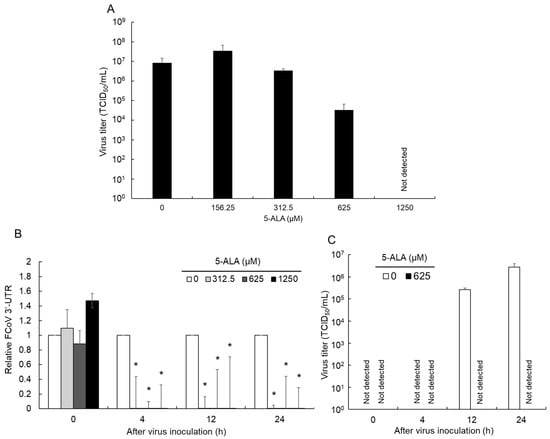 We also examined the inhibitory effects of 5-ALA on the proliferation of FCoV in the initial phase of virus proliferation using FCoV RNA synthesis as an index. No significant difference was observed in FCoV RNA synthesis between 5-ALA-treated and untreated cells 0 h after the FCoV inoculation (Figure 2B). On the other hand, FCoV RNA synthesis was significantly lower in 5-ALA-treated cells ≥ 4 h after the FCoV inoculation than in untreated cells. Similarly, the virus titer in the culture supernatant was determined. The virus titer in the culture supernatant from fcwf-4 cells treated with 625 μM 5-ALA remained below the detection limit for up to 24 h after inoculation (Figure 2C). In contrast, in the absence of 5-ALA, the virus titer began to increase after 12 h.