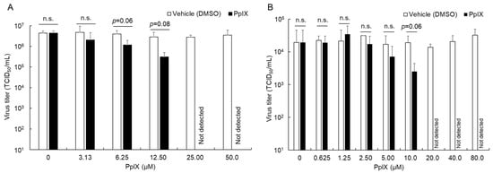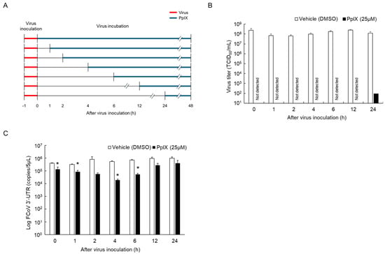 We investigated whether PpIX exerts antiviral effects against FIPV. After fcwf-4 cells were pretreated with PpIX for 24 h, FCoV was adsorbed by cells. After 48 h, the virus titer in the culture supernatant was measured. The results obtained showed that it decreased in a PpIX-concentration-dependent manner and was below the detection limit at a PpIX concentration of 25.0 µM or higher (Figure 3A). On the other hand, the virus titer in the culture supernatant from DMSO-treated fcwf-4 cells did not decrease.