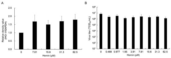 In this study, we investigated whether the induction of HO-1 contributed to antiviral effects against FCoV. To confirm whether HO-1 was induced in fcwf-4 cells treated with the HO-1 inducer, hemin, HO-1 gene expression was semiquantitatively analyzed relative to GAPDH gene expression. In fcwf-4 cells treated with hemin for 24 h, a slight increase was observed in HO-1 gene expression (Figure 5A). The virus titer in the culture supernatant from fcwf-4 cells treated with hemin for 24 h was measured 48 h after FCoV inoculation. No decrease was noted in the virus titer in the culture supernatant regardless of the concentration of hemin (Figure 5B).