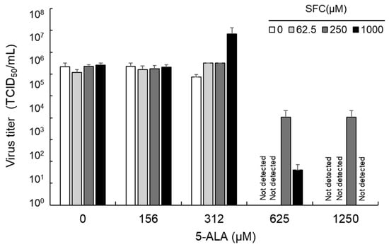 Impact of SFC on antiviral effects of 5-ALA. fcwf-4 cells were pretreated with the 5-ALA-SFC combination for 24 h. After viral adsorption, cells were cultured in MM without 5-ALA and SFC. The virus titer was measured 48 h after the virus inoculation.