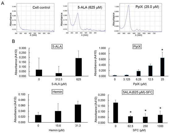 An extract from fcwf-4 cells treated with PpIX for 24 h (fcwf-4 cell extract) showed an absorbance spectrum reaching a peak at a wavelength of approximately 405 nm and several subpeaks at a wavelength ≥ 500 nm (Figure 7A). This was consistent with the previously reported absorbance spectrum of PpIX []. Based on the conditions set in our similar experiments conducted using different cells, we quantified the absorbance at a wavelength of 410 nm as the PpIX level. When cells were treated with 625 μM 5-ALA, the same absorbance spectrum was noted. On the other hand, in MM-treated control cells, there was no peak in absorbance at a wavelength of 410 nm. Therefore, the absorbance of an extract from cells treated with each compound at a wavelength of 410 nm was quantified as the concentration of PpIX. There was no increase in absorbance in the cell extract treated with 312.5 μM 5-ALA, whereas that in the cell extract treated with 625 μM 5-ALA increased (Figure 7B). The absorbance of a PpIX-treated cell extract at a wavelength of 410 nm increased in a PpIX concentration-dependent manner. A slight increase was observed in the absorbance of a hemin-treated cell extract. The absorbance of extracts from cells treated with a mixture of 625 μM 5-ALA and SFC at various concentrations was lower than that of an extract from cells treated with 5-ALA alone.