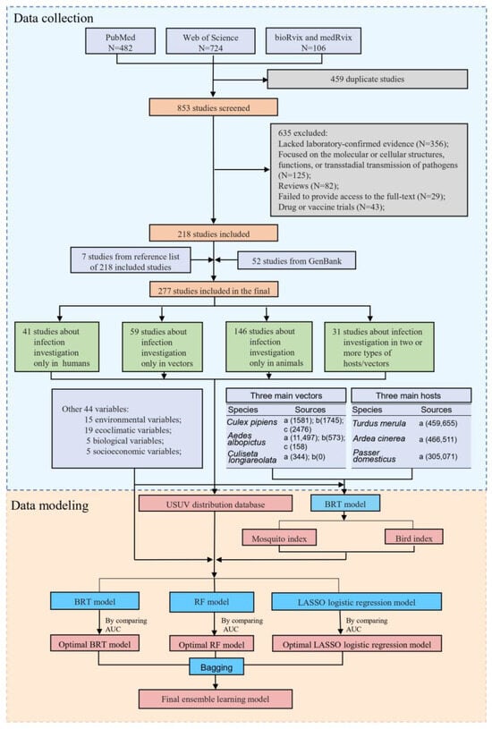 Flow diagram of the literature review and data modeling. The entire process can be divided into two parts, data collection and data modeling. IN the data sources of vectors and hosts, a presents GBIF, b presents VectorMap, and c represents other articles. The numbers in numbers parentheses for the sources of data of three main vectors and three main hosts represent the corresponding number of records. BRT: boosted regression tree. RF: random forest. LASSO: least absolute shrinkage and selection operator.