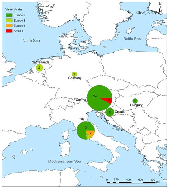 USUV, which originated in Africa, was initially isolated from Culex neavei around the Usutu River in Swaziland in 1959 []. Subsequently, it has been reported across various regions across Africa []. Recently, USUV has gained significant attention due to its emergence and expansion in Europe, as well as highly diversified circulating lineages. The first report of USUV in Europe was identified in Austria in 2001 [], followed by reports in Hungary [], Spain [], Switzerland [], Germany [], and Greece []. In fact, the occurrence of USUV in Europe can be traced back to Italy in 1996, when it caused a considerable number of Turdus merula deaths [] but remained silent for many years. Furthermore, there have been reports of USUV spreading beyond Europe and Africa. For instance, it has been found in mosquitoes [] and horses in Israel [].