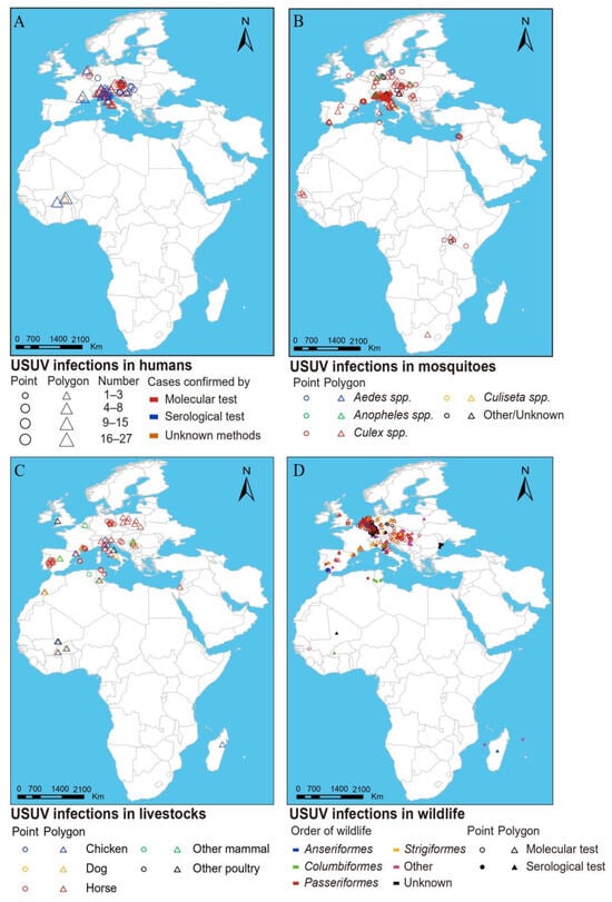 European, African, and Middle Eastern distribution of USUV detection in vectors and hosts. (A) Humans. (B) Vectors. (C) Livestock. (D) Wildlife. Positive detections in humans and wildlife were determined by molecular and serological tests, positive detections in vectors were determined only by molecular tests, and positive detections in livestock were determined only by serological tests.