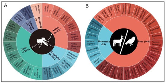 The number of vectors and animal species from which USUV was detected. (A) USUV detected in vectors, including 20 mosquito species, further classified by genus. Numbers in parentheses represent the positive rate of USUV infection. (B) USUV detected in animals, including 146 avian species and 20 mammalian species, further classified by order. Numbers in parentheses represent the exact number of species.