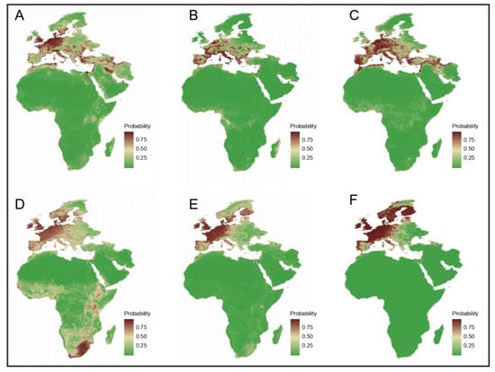 Predicted geographical distribution of the three main vectors and three main animal hosts. (A) Culex pipiens. (B) Aedes albopictus. (C) Culiseta longiareolata. (D) Ardea cinerea. (E) Passer domesticus. (F) Turdus merula. Occurrence was predicted by the BRT model, for which randomly selecting “control” from 30 to 3000 km from the occurrence cells with 1:1 sampling ratio was applied. The color legend represents a scale of the relative probability that the species occurred in that location from 0 (green, low) to 1 (red, high).