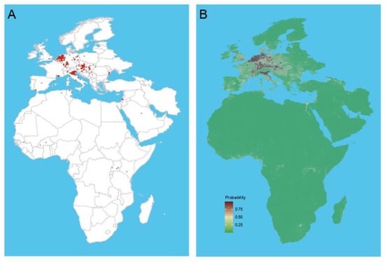 The actual recorded and predicted distributions of USUV. (A) The actual recorded occurrence of USUV. The red dot indicates the actual USUV occurrence of point data and polygon data with an area below 900 km2. (B) The predicted occurrence of USUV. The occurrence was predicted by composite learner, for which the bootstrap aggregation (bagging) method was applied and the best BRT, RF, and LASSO models weighted based on their AUCs. The color legend represents a scale of the relative probability that the USUV occurred in that location from 0 (green, low) to 1 (red, high).