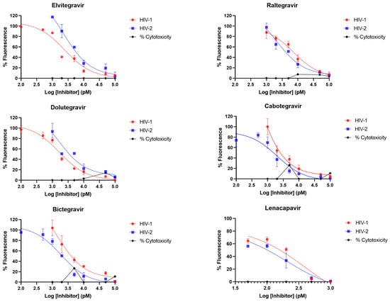 48-well plates were seeded with 25,000 Jurkat cells (ATCC, Manassas, VA, USA) in 200 µL of RPMI medium complemented with 10% FBS and 1% L-glutamine for 24 h. Cells were then treated with a serial dilution of the inhibitors ranging from 1 nM to 1 µM of INSTIs (100 pM and 500 pM additional concentrations were used for some inhibitors to better calculate IC50 values) and 100 pM to 100 nM of lenacapavir in fresh medium without antibiotics and incubated at 37 °C for 3 h; thereafter, the cells were transduced with 4 ng equivalent to RT/well activity of HIV-1 or HIV-2 in the presence of 8 µg/mL polybrene/well and further incubated at 37 °C for 48 h. Cells were collected in 400 µL cold sterile PBS, and quantitative analysis of the transduction efficiency in the presence of the inhibitors was assessed by flow cytometry (FACS caliber, BD Biosciences, Franklin Lakes, NJ, USA). The results were analyzed by FlowJo Software Version 10 (Becton, Dickinson, and Company, 2019) to determine the percentage of mCherry fluorescence in 5000 cells, indicating transduction by HIV-2 and HIV-1, respectively. GraphPad Prism ver. 9 (GraphPad Software, Inc. Boston, MA, USA) performed the IC50 calculations and graphs.