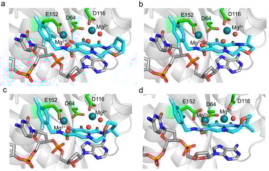 Docked integrase inhibitors compared to experimental structure. Structure of (a) bictegravir, (b) cabotegravir, and (c) dolutegravir inhibitors docked by PLANTS in the active site of HIV-2 integrase. The inhibitor (teal), the DNA substrate (gray), and the Mg2+ coordinating active site residues (green) are represented in stick format, the Mg2+ ions (deep teal), and the coordinated water molecules (red) as spheres. (d) For comparison, the SIV integrase crystal structure (PDB ID: 6RWN [67]) that binds dolutegravir, applying the same coloring and representation schemes.
