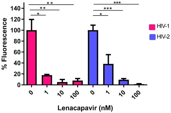 HIV-1 and 2 pseudovirions with aberrant capsids produced in the presence of lenacapavir. Pseudovirions were produced in the presence of 1, 10, and 100 nM of lenacapavir. The y axis indicates percentage of transduction efficiency (percentage of fluorescence), and x axis denotes the concentrations of lenacapavir used to treat the cells. Control cells were only treated with DMSO. Results are concluded from triplicate measurements. * p value ≤ 0.05, ** p value ≤ 0.01, *** p value ≤ 0.001.