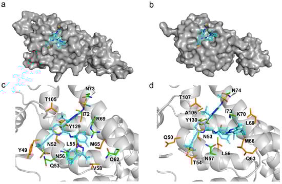 (a) Lenacapavir in complex with the HIV-2 capsid protein (p26) docked by AutoDock Vina to the AlphaFold model; (b) in complex with the active site of HIV-1 capsid protein (p24), crystal structure (PDB ID: 6V2F). The protein is represented with a gray surface and lenacapavir as blue sticks. Closeup of lenacapavir in (c) the HIV-2 model and (d) the HIV-1 crystal structure. The inhibitor (teal) and the interacting capsid residues (hydrogen bond forming—green, apolar interaction forming—brown) are represented as sticks, the rest of the protein as cartoon. The interactions were determined with LigPlot+.