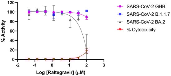 Inhibition profiling of Raltegravir against SARS-CoV-2. Efficacy against the prototypical Wuhan-Hu-1 (GBH) is shown in purple, while that against the B.1.1.7 variant is shown in blue, and omicron BA.2 is shown in grey. Percentage of cytotoxicity is indicated in red. Inhibition profiling was carried out in Vero E6 cells and then confirmed in A549-Dual™ hACE2-TMPRSS2 cells. y axis indicates percentage of inhibition, and x axis is the logarithmic transformation of the inhibitor’s concentration. Results represent at least triplicate measurements.