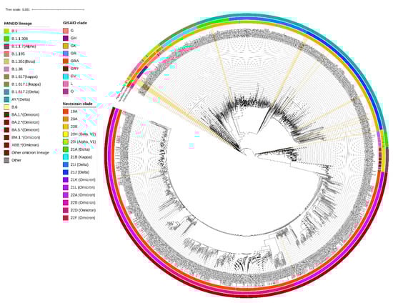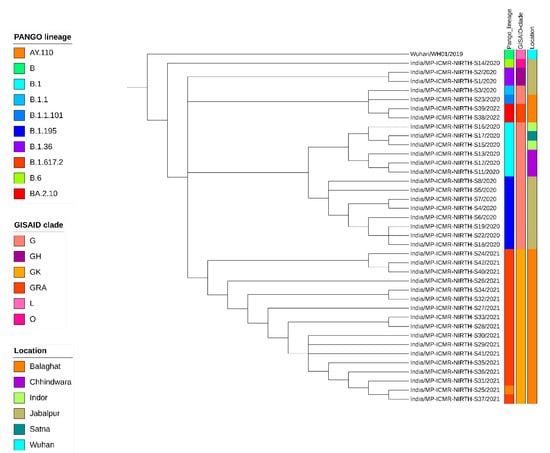 We have downloaded all the complete SARS-CoV-2 genomes (n = 2160) (Table S1) from central India for the phylogenetic analysis of SARS-CoV-2 genome sequences generated in this study, which were aligned with the strains reported from central India, using Augur Nextstrain’s phylodynamic pipeline toolkit “https://github.com/nextstrain/ncov (accessed on 10 May 2024)” [23,24]. Afterward, the maximum likelihood phylogenetic tree was constructed using the Augur tree implementation pipeline with IQ-TREE v1.6.1 [25] with the default parameters. The selected metadata information plotted in the time-resolved phylogenetic tree was constructed using TreeTime v0.81 [26], which was then annotated and visualized in the iTOL website [27].