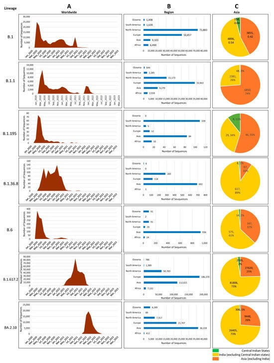 Global distribution of 5 lineages of SARS-CoV-2 from GISAID database until August 2022. (A) Month-wise distribution of lineages from worldwide submitted data. (B) Distribution of lineages across different continents of the world. (C) Comparison of lineages present in central Indian states with other Indian states and Asian countries.