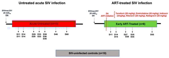 Study protocol. A total of 21 female Rhesus macaques (RMs) were infected intravenously with 20 50% animal infectious doses (AIDs) of SIVmac251 virus, and the specimens were collected in the acute phase of infection in 13 animals in the absence of ART. Eight monkeys were treated four days after the infection in a daily manner with an ART cocktail. Blood specimens were obtained from 10 SIV-uninfected animals that were used as controls. Black arrows represent the time when samples from whole blood were taken. Of note, each “D” followed by a number indicates one animal; therefore, in some cases, blood was collected from more than one animal on the same day. Nota bene: Blood samples from 3 animals were collected before and after SIV infection.