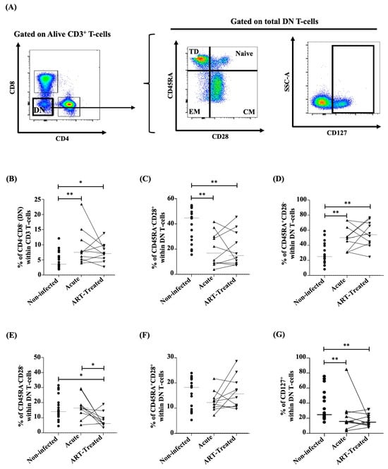 (A) Gating strategy used in flow cytometry to determine total CD3+CD4−CD8− (double-negative, DN) T-cell (left) and DN T-cell memory subsets based on CD45RA/CD28 and CD127 expression (right) in the human study. Percentages determined in flow cytometry of total DN T-cells (B), central memory (CM, CD45RA−CD28+) (C), terminally differentiated (TD, CD45RA+CD28−) (D), effector memory (EM, CD45RA−CD28−) (E), and naïve (CD45RA+CD28+) (F) subsets within DN T-cells in the human study. (G) Percentages determined in flow cytometry of CD127+ DN T-cells in the human study. After the Kruskal–Wallis analysis, the differences among the three study groups were determined by a nonparametric Mann–Whitney rank test for unpaired variables (non-infected vs. acute, non-infected vs. ART-treated) and a Wilcoxon signed-rank test for paired variables (acute vs. ART-treated). Sample sizes in flow cytometry analysis: non-infected (n = 20), acute, and ART-treated (n = 10). Horizontal lines in graphs represent the median. Only statistical significances are presented (*, p < 0.05; **, p < 0.01).