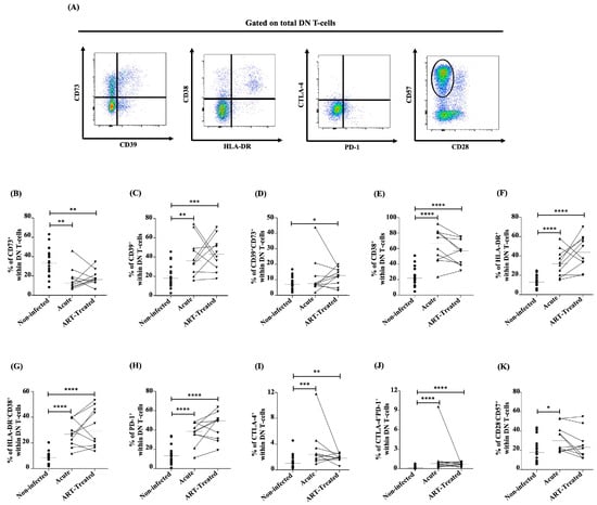 (A) Gating strategy used in flow cytometry to determine CD73/CD39, CD38/HLA-DR, CTLA-4/PD-1, and CD57/CD28 expression within DN T-cells in the human study. Percentages determined in flow cytometry of CD73+ (B), CD39+ (C), CD39+CD73+ (D), CD38+ (E), HLA-DR+ (F), HLA-DR+CD38+ (G), PD-1+ (H), CTLA-4+ (I), CTLA-4+PD-1+ (J), and CD28−CD57+ (K) within DN T-cells in the human study. After the Kruskal–Wallis analysis, the differences among the three study groups were determined by a nonparametric Mann–Whitney rank test for unpaired variables (non-infected vs. acute, non-infected vs. ART-treated) and Wilcoxon signed-rank test for paired variables (acute vs. ART-treated). Sample sizes in flow cytometry analysis: non-infected (n = 20), acute, and ART-treated (n = 10). Horizontal line s in graphs represent the median. Only statistical significances are presented (*, p < 0.05; **, p < 0.01; ***, p < 0.001; ****, p < 0.0001).