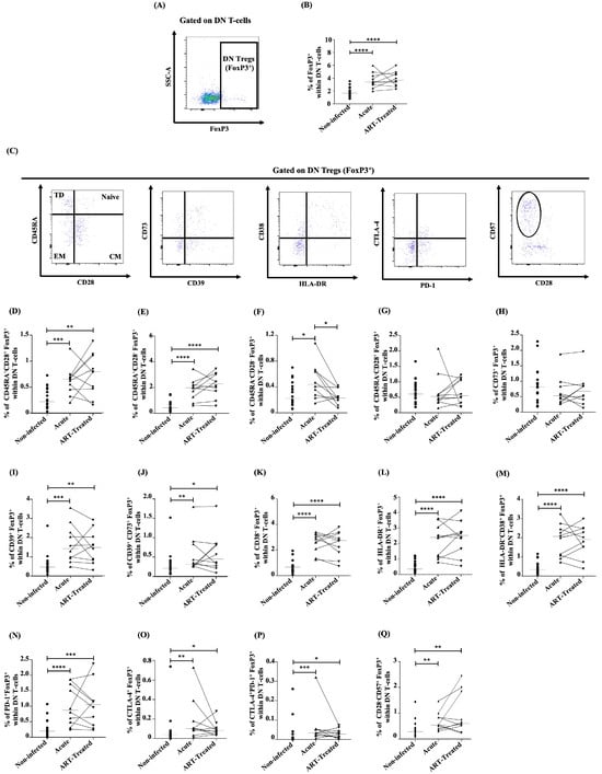 (A) Gating strategy used in flow cytometry to determine total FoxP3+ DN T-cells (DN Tregs) (left) in the human study. (B) Percentages determined in flow cytometry of total DN Tregs within DN T-cells in the human study. (C) Gating strategy used in flow cytometry to determine DN Treg memory subsets based on CD45RA/CD28, CD73/CD39, CD38/HLA-DR, CTLA-4/PD-1, and CD57/CD28 expression within DN Tregs in the human study. Percentages determined in flow cytometry of naïve (CD45RA+CD28+) (D), terminally differentiated (TD, CD45RA+CD28−) (E), effector memory (EM, CD45RA−CD28−) (F), central memory (CM, CD45RA−CD28+) (G), CD73+FoxP3+ (H), CD39+FoxP3+ (I), CD39+CD73+FoxP3+ (J), CD38+FoxP3+ (K), HLA-DR+FoxP3+ (L), HLA-DR+CD38+FoxP3+ (M), PD-1+FoxP3+ (N), CTLA-4+FoxP3+ (O), CTLA-4+PD-1+FoxP3+ (P), and CD28−CD57+FoxP3+ (Q) DN T-cells in the human study. After the Kruskal–Wallis analysis, the differences among the three study groups were determined by a nonparametric Mann–Whitney rank test for unpaired variables (non-infected vs. acute, non-infected vs. ART-treated) and Wilcoxon signed-rank test for paired variables (acute vs. ART-treated). Sample sizes in flow cytometry analysis: non-infected (n = 20), acute, and ART-treated (n = 10). Horizontal line in graphs represent the median. Only statistical significances are presented (*, p < 0.05; **, p < 0.01; ***, p < 0.001; ****, p < 0.0001).