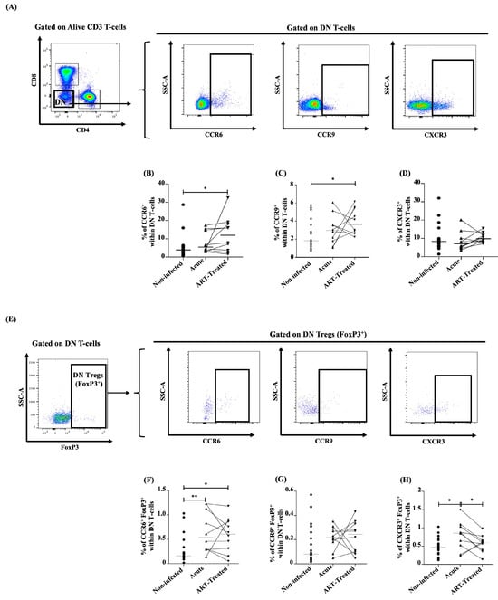 (A) Gating strategy used in flow cytometry to determine CCR6, CCR9, and CXCR3 expression within DN T-cells in the human study. Percentages determined in flow cytometry of CCR6+ (B), CCR9+ (C), and CXCR3+ (D) within DN T-cells in the human study. (E) Gating strategy used in flow cytometry to determine CCR6, CCR9, and CXCR3 expression within DN Tregs in the human study. Percentages determined in flow cytometry of CCR6+FoxP3+ (F), CCR9+FoxP3+ (G), and CXCR3+FoxP3+ (H) within DN T-cells in the human study. After the Kruskal–Wallis analysis, the differences among the three study groups were determined by a nonparametric Mann–Whitney rank test for unpaired variables (non-infected vs. acute, non-infected vs. ART-treated) and Wilcoxon signed-rank test for paired variables (acute vs. ART-treated). Sample sizes in flow cytometry analysis: non-infected (n = 20), acute, and ART-treated (n = 10). Horizontal lines in graphs represent the median. Only statistical significances are presented (*, p < 0.05; **, p < 0.01).