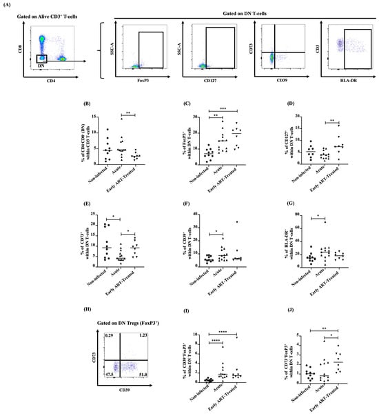 (A) Gating strategy used in flow cytometry to determine total CD3+CD4−CD8− (double-negative, DN) T-cells, total FoxP3+ DN T-cells (DN Tregs), CD127+, CD37/CD73, and HLA-DR+ DN T-cells in Rhesus macaques. Percentages determined in flow cytometry of total DN T-cells (B), total DN Tregs (C), CD127+ (D), CD73+ (E), CD39+ (F), and HLA-DR+ (G) within DN T-cells in Rhesus macaques. (H) Gating strategy used in flow cytometry to determine CD39/CD73 within DN Tregs in Rhesus macaques. Percentages determined in flow cytometry of CD39+FoxP3+ (I) and CD73+FoxP3+ (J) within DN T-cells in Rhesus macaques. After the Kruskal–Wallis analysis, the differences among the three study groups were determined by a nonparametric Mann–Whitney rank test for unpaired variables (non-infected vs. acute, non-infected vs. early ART-treated, and acute vs. early ART-treated) in Rhesus macaques. Sample sizes in flow cytometry analysis in Rhesus macaques: non-infected (n = 10), acute (n = 13), and early ART-treated (n = 8). Horizontal lines in graphs represent the median. Only statistical significances are presented (*, p < 0.05; **, p < 0.01; ***, p < 0.001; ****, p < 0.0001).
