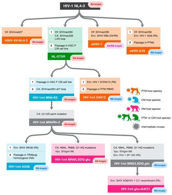 Derivation pathway of minimally modified HIV-1 infectious molecular clones that have been evaluated in nonhuman primates (NHPs). Color coding corresponds to the NHP species in which each virus has been inoculated. X4-tropic, CXCR4-tropic; R5-tropic, CCR5 tropic; X4/R5-tropic, CXCR4/CCR5 dual tropic; Env, envelope; CA, capsid; Vif, viral infectivity factor; Vpu, virus protein u; PTM, pigtail macaque; CM, cynomolgus macaque; RM, rhesus macaque.