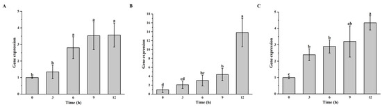 Gene expression level of mcp in host bacteria after phage vB_G30_01 infestation at 0, 3, 6, 9, and 12 h. (A) S. warneri G30 served as the positive control group; (B) S. epidermidis G28; (C) B. velezensis D103. Different letters (a–d) indicate the degree of significant difference between treatments. Values with the same letter above the bar graph indicate no significant difference according to the Tukey test.