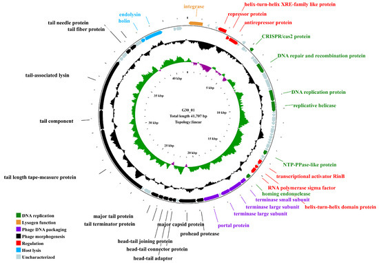 The genome of the phage vB_G30_01 is a linear DNA strand comprising 41,707 base pairs, with a GC content of 33.54%. The bases of all mapped reads are about 2.6 G, resulting in a sequencing depth of 64,000×. It contains 67 predicted open reading frames (ORFs) (Table S4), totaling 38,208 base pairs, which account for 91.61% of the entire genome. The average length of an ORF is 570.27 base pairs, resulting in a gene density of 1.61 genes per kilobase and an average GC content of 33.78%. Among the ORFs, 55 commence with the initiation codon ATG, representing 82.09% of all ORFs, 8 start with TTG (11.94%), and 4 start with GTG (5.97%). Annotation of the ORFs using the NCBI NR database revealed that 61 ORFs matched homologous gene families, constituting 91.04% of the total. Out of these, 31 ORFs are predicted to have potential gene functions. They are classified into functional categories, such as DNA replication, regulation, lysogeny, host lysis, phage DNA packaging, and phage morphogenesis. Notably, annotations for 29 ORFs are associated with Staphylococcus phages, while the remaining 38 are linked to Caudoviricetes phages.