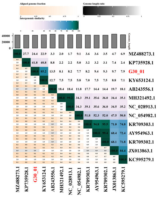 The VIRIDIC software v1.1 was utilized to calculate the genomic similarity between vB_G30_01 and related phages in the database, as depicted in the heatmap (Figure 4). The results revealed that vB_G30_01 exhibited the highest genomic similarity, of 85.2%, with Staphylococcus phage IME1367_01 (KY653124.1), followed by phage IME-SA4 (KP735928.1) at 41.8%, phage vB_SarS_BM31 (MZ488273.1) at 24.4%, and phage phiPVL108 (AB243556.1) at 13.5%. The remaining phages displayed less than 10% similarity.