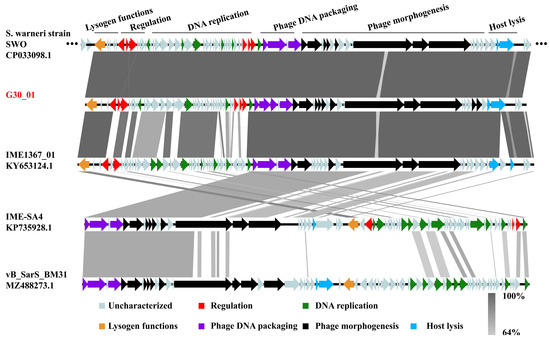 The prophage regions within the bacterial genome of Staphylococcus warneri strain SWO, as predicted by Phaster, were analyzed alongside four closely related phages (IME1367_01, IME-SA4, and vB_SarS_BM31) using Easyfig software v2.2.3 for comparative genomics, as depicted in Figure 5. The prophage region in the Staphylococcus warneri SWO genome exhibited high similarity to the genome of phage vB_G30_01, with the exception of genes associated with phage morphogenesis and lysis function. Phage IME1367_01 displayed substantial similarity to vB_G30_01 in lysogenic functions, phage DNA packaging, and phage morphogenesis but exhibited notable differences in genes related to transcription regulation and DNA replication. In contrast, IME-SA4 and vB_SarS_BM31 showed very low genomic similarities. Nevertheless, it is noteworthy that all phages exhibited over 60% similarity in regions related to phage DNA packaging and certain aspects of phage morphogenesis.