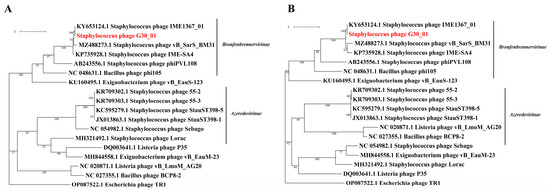 Phylogenetic trees of vB_G30_01 and related groups phylogenetic trees were constructed based on the amino acid sequences, focusing on the following two key components: (A) the terminase large subunit and (B) the major capsid protein. vB_G30_01 is distinctly highlighted in red for easy identification.