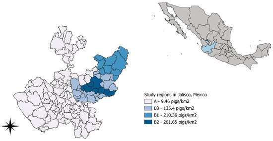 The pig density in each region was 9.46, 210.36, 261.65, and 135.4 pigs/km2 in regions A, B1, B2, and B3, respectively. The regions were delimited geographically and by animal density, as shown in Figure 1.