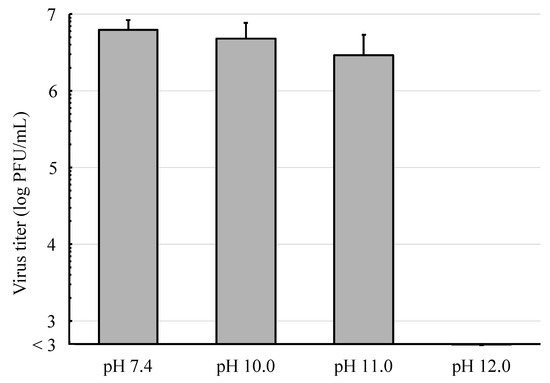 The infectivity of IAV was not significantly affected after treatment with alkaline solutions at pH 10.0 or 11.0 (Figure 1). By contrast, treatment with the alkaline solution at pH 12.0 reduced the infectivity by more than three orders of magnitude compared to the control.