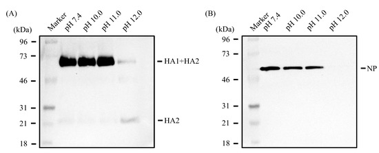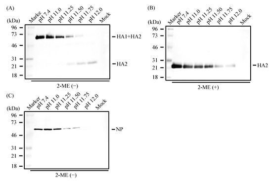 When analyzed by Western blotting under non-reducing conditions (Figure 2A,B), viral proteins, HA (HA1 + HA2), and NP could be detected after treatment with the alkaline solution at pH 10.0 or 11.0 as efficiently as those at pH 7.4 (control). By contrast, these proteins became barely detectable after treatment with the alkaline solution at pH 12.0; interestingly, however, the amount of HA2 subunits apparently increased compared with the control (Figure 2A).