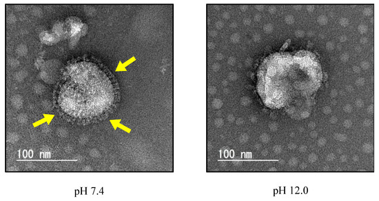 The effect of alkaline solutions on the morphology of IAV particles is shown in Figure 3. Surface spikes on IAV particles at pH 7.4 were clearly visible. By contrast, such spikes could not clearly be observed after treatment with the alkaline solution at pH 12.0. In order to minimize possible mechanical damage to the IAV particles, the alkaline-treated viral particles were not further concentrated.
