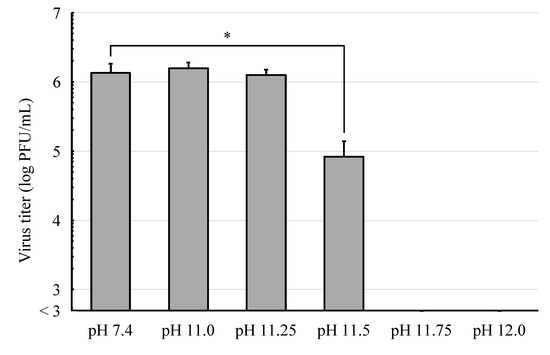 MDCK cells were infected with IAV which had been treated with more detailed alkaline solutions for 1 min (n = 4) and incubated for 72 h, and the viral infectivity was evaluated by a plaque assay. The results are presented as mean ± standard deviation. * p < 0.01.