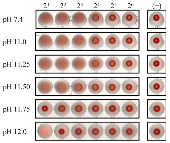 As described so far, the infectivity and protein stability of IAV was clearly affected by treatment of IAV with the alkaline solution at pH 12.0 but not by the alkaline solution at pH 11.0. To further analyze these findings, we examined the effect of alkaline solutions at pH 11.25, 11.5, or 11.75 on the IAV infectivity (Figure 4). Interestingly, the infectivity of IAV was also not affected by the alkaline solution at pH 11.25, while it was reduced by approximately one order of magnitude by the alkaline solution at pH 11.5 compared to the control. Notably, treatment of IAV with alkaline solutions at pH 11.75 or pH 12.0 reduced the infectivity by more than three orders of magnitude. Consistently, the alkaline solutions at pH 11.0 or pH 11.25 did not affect the viral HA activity, while those at pH 11.75 and pH 12.0 caused a noticeable reduction in the viral HA activity (Figure 5). The leftmost well in the lane at pH 12.0 was observed under a microscope and it was confirmed that the guinea pig red blood cells had been hemolyzed.