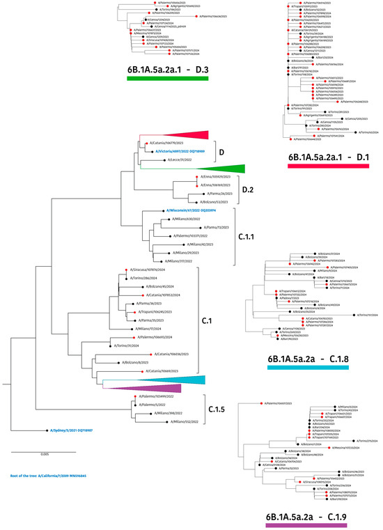 In more detail, the 5a.2a cluster, which was represented by the 2023 vaccine strain for the Southern Hemisphere (A/Sydney/5/2021), has undergone further evolution to yield the three subclades C.1 (n = 6), C.1.8 (n = 11), and C.1.9 (n = 12). Moreover, within the clade 5a.2a.1, five different subclades were recognized: C.1.1, including the cell culture-based 2023–2024 vaccine strain for use in the Northern Hemisphere (A/Wisconsin/67/2022), and a single Sicilian strain, D.2 (n = 2), whereas two larger clusters further diverged to form subclades D.1 (n = 28) and D.3 (n = 12), together with the egg-based vaccine strain A/Victoria/4897/2022, recommended for the last season. Only one sequence from Sicily was classified as subclade D, strictly related to this latter vaccine strain (Figure 2).