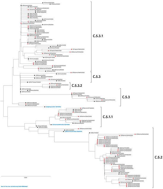 Neighbour-joining phylogenetic tree of HA nucleotide sequences of influenza A(H1N1)pdm09 strains collected in Sicily between October 2023 and April 2024. Solid red circles indicate the study sequences, while A(H1N1)pdm09-like vaccine strains are shown in blue. The strain A/California/7/2009 (GenBank: MN596845) was used as an outgroup. Clades and subclades are defined according to the Nextstrain classification.