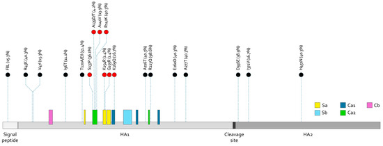 Hemagglutinin elicits the primary neutralizing response harbouring the antigenic and receptor-binding sites on the globular head domain (HA1). Among influenza A, five major antigen sites are recognized in A(H1N1)pdm09 (Sa, Sb, Ca1, Ca2, and Cb) and A(H3N2) (A through E) [16], as well as the sialic acid receptor-binding sites (RBSs) [17,18]. Evolution due to natural selection or positive pressure may favour the accumulation of mutation in the HA protein, which may lead to the emergence of influenza virus strains able to escape the existing neutralizing antibodies, thus compromising the efficacy of vaccines.