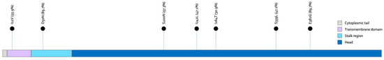 Figure 4 represents the lollipop plot of mutations recognized in the amino acid hemagglutinin-deduced sequences of A(H1N1)pdm09 strains in Sicily. The AA change R233Q was found in most strains (98.6%), while about half of the strains bore the substitutions R45K, T120A/E/I, A216T, E260D, and A277T, as well as D356E and H451N in the HA2 subunit. Additionally, some mutations were identified within the major antigenic sites. This is the case for K154R and G155R in Sa; K169Q in Ca1; and S137P, A139D/T, A141V, and R142K in Ca2, of which S137P and R142K were the most represented, being respectively found in 36.1% and 40.3% of A(H1N1)pdm09-like viruses. No variations were documented in the epitopes Sb and Cb.