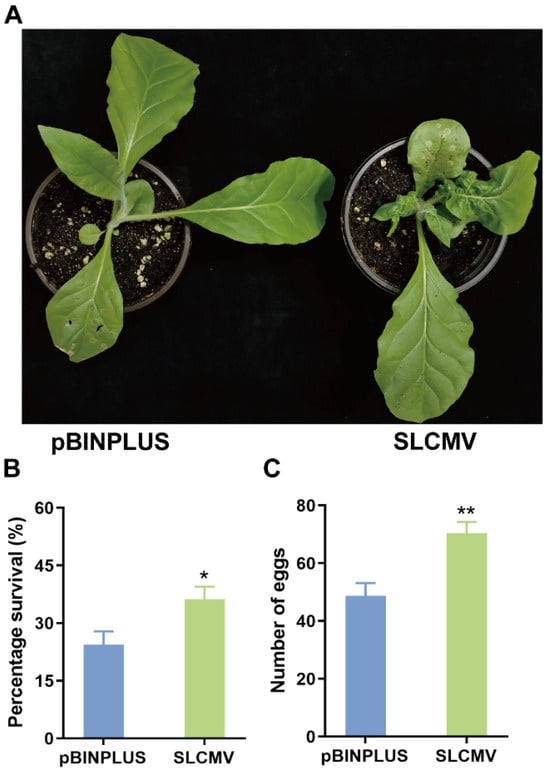 At 25 days post inoculation, PCR verified the presence of SLCMV in SLCMV-inoculated tobacco plants (Figure S1). Compared to the control (pBINPLUS), SLCMV-infected tobacco plants exhibited stunted growth, severe leaf curl, and wrinkling (Figure 1A). The following whitefly bioassay showed that SLCMV infection of tobacco plants significantly increased the survival and fecundity of Asia II 1 whiteflies (Figure 1B,C). These results suggest that SLCMV significantly modulates plant defenses against its whitefly vector.