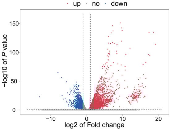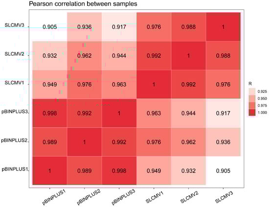 The expression level of all genes was calculated (Table S2). Analysis of overall gene expression patterns showed that the Pearson’s correlation coefficients between samples from the same treatment (pBINPLUS or SLCMV) were much higher than those between samples from different treatments (Figure 2). When analyzing differentially expressed genes (DEGs) according to the criteria fold change > 2 or <0.5 and p < 0.05, 5278 upregulated and 2134 downregulated DEGs were identified (Table S3 and Figure 3).