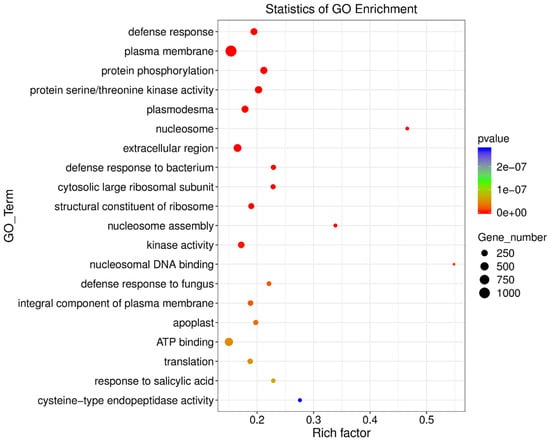 To identify the DEGs that play pivotal roles in biological pathways and functional networks, a GO enrichment analysis was conducted. DEGs were found to actively participate in various pathways, and the top 20 most significantly enriched GO terms were identified (Table S4 and Figure 4). Of the GO terms, the defense response stood out as the most significantly enriched. Notably, two related terms were similarly enriched, namely the defense response to bacterium and the defense response to fungus. Several terms involved in regulating cellular components were enriched, including the plasma membrane, plasmodesma, nucleosome, extracellular region, and the cytosolic large ribosomal subunit, an integral component of the plasma membrane and apoplast. Additionally, a handful of terms displaying molecular function were enriched, such as protein serine/threonine kinase activity, structural constituent of ribosome, kinase activity, nucleosomal DNA binding, ATP binding, and cysteine-type endopeptidase activity.