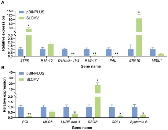 Effect of SLCMV infection of tobacco plants on the expression of DEGs. (A,B) expression of DEGs. Tobacco plants were inoculated with pBINPLUS (empty vector) and SLCMV DNA-A+DNA-B. Plants were sampled for gene expression analysis at 25 days post inoculation. The number of replicates was 5–6. * p < 0.05 and ** p < 0.01 (independent t-test).