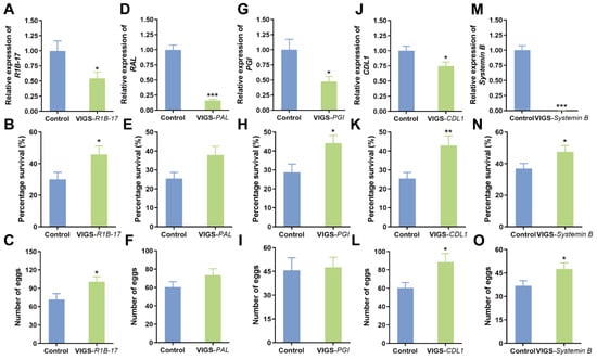 Effects of DEG silencing on whitefly performance. (A,D,G,J,M) Silencing efficiency; (B,E,H,K,N) survival rate of whiteflies on control and virus-induced gene silencing (VIGS) plants; (C,F,I,L,O) fecundity of whiteflies on control and VIGS plants. The number of replicates was 7–19 for (A,D,G,J,M) and 22–31 for (B,C,E,F,H,I,K,L,N,O). * p < 0.05, ** p < 0.01, and *** p < 0.001 (independent t-test).