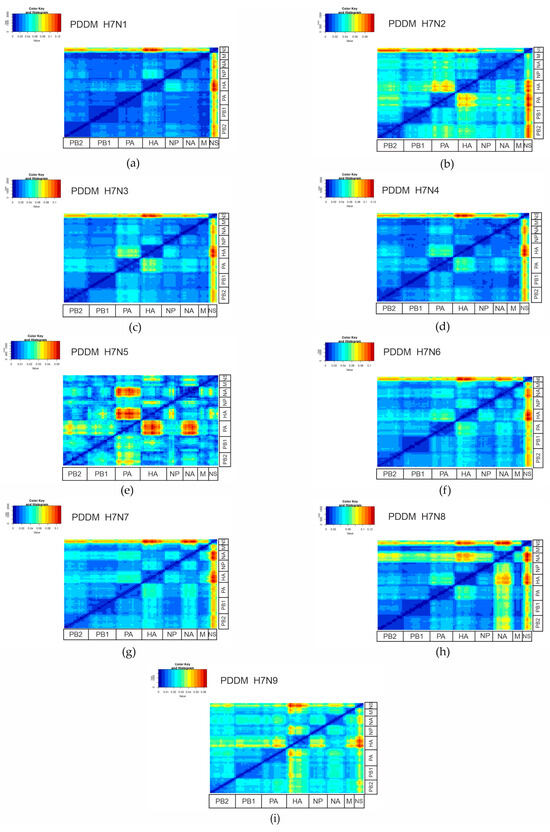 Pairwise distance divergence matrices (PDDMs) for H7Nx influenza viruses, namely H7N1 (a), H7N2 (b), H7N3 (c), H7N4 (d), H7N5 (e), H7N6 (f), H7N7 (g), H7N8 (h), and H7N9 (i) (window = 500 nucleotides, step = 150 nucleotides). The color gradient scale shows the root mean square error (RMSE) values in PDCP as a figure.